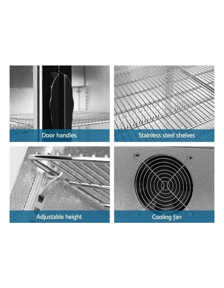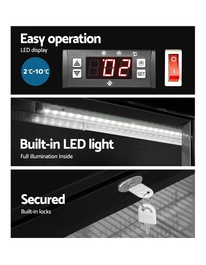 Our spacious Devanti Bar Fridge with double doors is great for keeping a variety of food and beverages chilled and cooled. Designed with adjustable temperature settings between 2C and 10C, the energy-efficient bar fridge lets you set your desired coolness and freshness. Other great features include fan-assisted cooling, LED temperature display, heavy-duty adjustable shelves, double-glazed tempered glass doors, built-in handles and consistent refrigeration to name a few. The bar fridge is also totally eco-friendly with its R600a freon-free refrigerant and well-made for robust use, such as the pressure-injected foam insulation and built-in LED light to ensure operation is smooth, quiet and hassle-free. The fridge also comes with built-in locks to keep the contents safe and secure, especially useful in a retail environment after you close for the night. Perfect for commercial environments such as bars, dessert shops, cafes and restaurants, the Devanti Bar Fridge is a cool investment time and again.