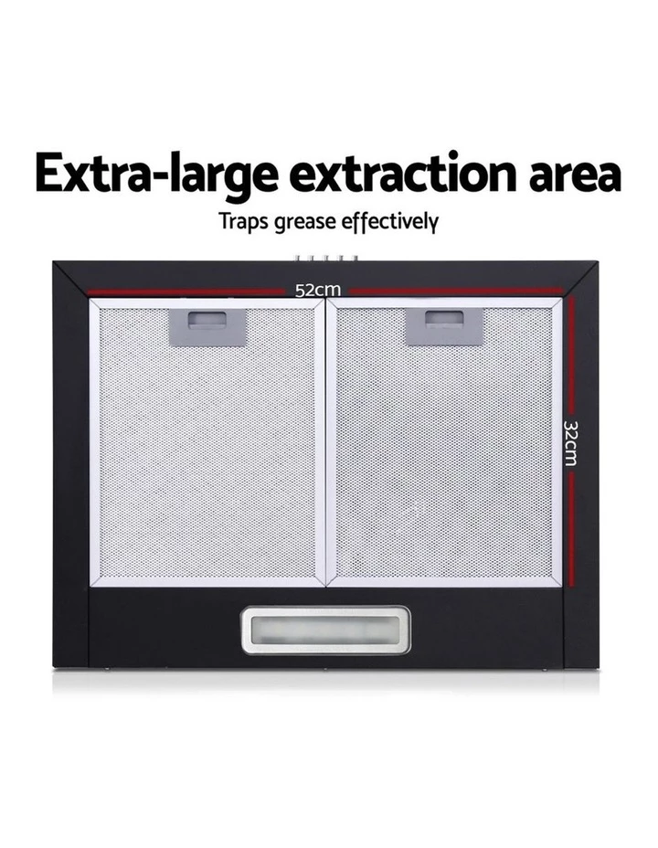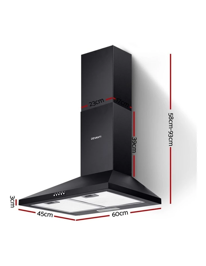 Say goodbye to smoky fumes and unwelcomed cooking odours with the Devanti Range Hood. With its high-performance motors, the black powder-coated steel range hood provides a steady upflow and filtered extraction of fumes and oil to keep your cooktop area clean and fresh after every use. With its 3-speed rocker button switches, the extraction speed can be adjusted to suit the circumstances. Other features include two non-stick 5-layer aluminium filters that are removable and replaceable and two bright 3W LED lamps to facilitate your illuminated cooking. The range hood is wall mounted and the chimney can be adjusted to fit the installation space.