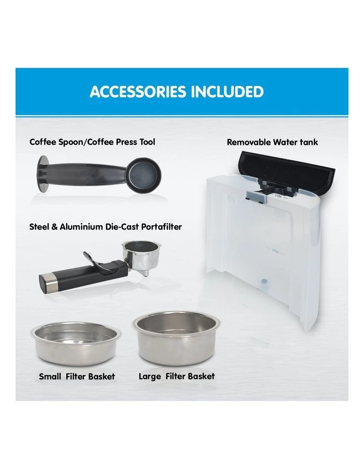 CONTENTS: * 1x Hauffmann Davis espresso machine * 1x Portafilter * 1x Removable transparent water tank * 1x Small filter basket (for 1 cup of coffee) * 1x Large filter basket (for 2 cups of coffee) * 1x Coffee spoon/coffee press tool * 1x User manual