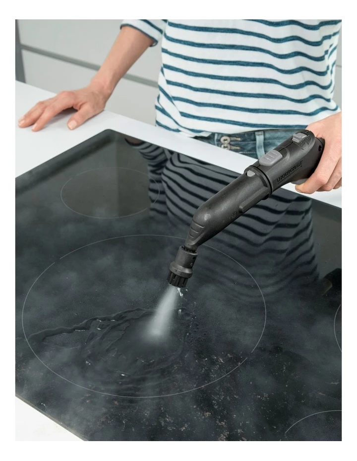 The SC 5 EasyFix Premium is not only the most powerful steam cleaner in its class (4.2 bar steam pressure), it is also versatile and functional. It includes the EasyFix floor nozzle with flexible joint and efficient lamella technology, a convenient hook-and-loop system for attaching the microfibre floor cloth to the floor nozzle without having to come into contact with dirt, a carpet glider for freshening up carpets as well as an iron option for connecting a steam pressure iron. In addition to its equipment, the SC 5 EasyFix Premium also impresses with its chemical-free thoroughness: Thorough cleaning removes 99.99% of all common household bacteria from common household hard surfaces. Everything from the hob to the smallest crack is cleaned hygienically thanks to the versatile accessories. With the VapoHydro function, all the dirt removed is simply washed away with hot water. Using four-stage steam regulation, the steam intensity can be adapted to the surface and the dirt. And the water tank that can be permanently refilled enables uninterrupted cleaning. Additional extras: Integrated cable storage compartment, accessory storage compartment and parking position for the floor nozzle.