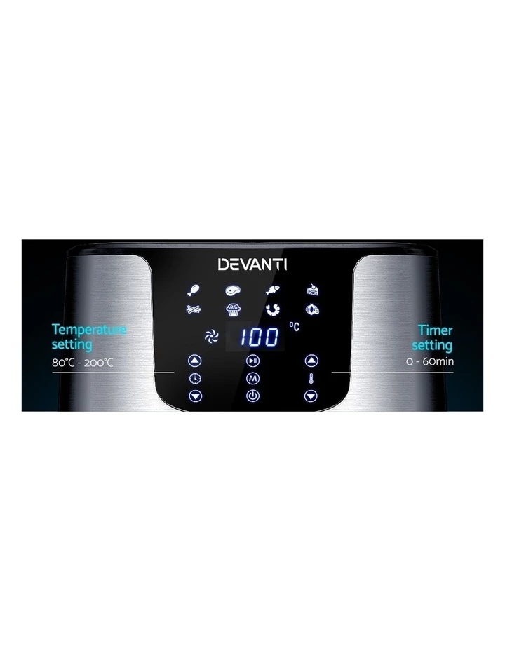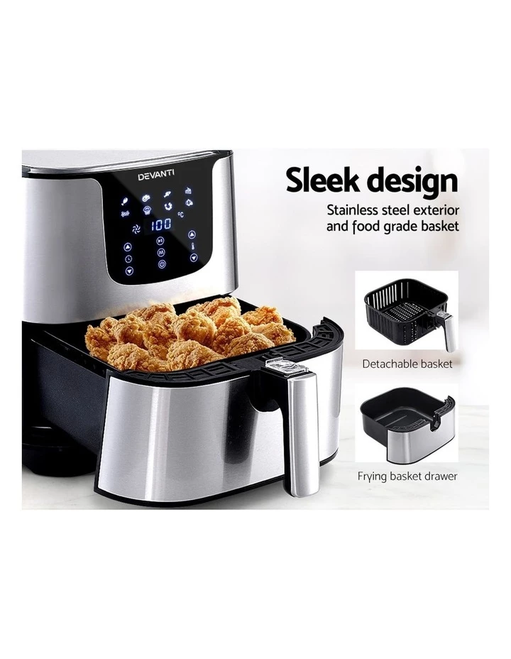 With its stunning and sleek stainless steel exterior, our Devanti Air Fryer turns the ordinary into the extraordinary. And that goes too for its exceptional cooking abilities. With its innovative air frying technology and 1700W of power, your cooking is done efficiently and thoroughly with less odours. Better still, all the wonderful cooking is done without a single drop of oil and yet is as delicious and sumptuous as traditional methods. In fact, foods cooked in in our air fryer have up to 80% less fat than deep-fried foods. This model has an all-in-one design and does not only fry food, but also roasts, grills and bakes. Just set in the cooking mode (up to eight to choose from) or time (up to 60 minutes) and temperature on the easy-to-use LCD touch controls, then leave all the hard work to the air fryer. Other great features include an auto shut-off function, non-stick pan and heat shield vent for good air circulation. The air fryer has a large 7L capacity making it suitable for most families. Most importantly, the components are dishwasher-safe, which makes the cleaning up process as easy as the cooking process.