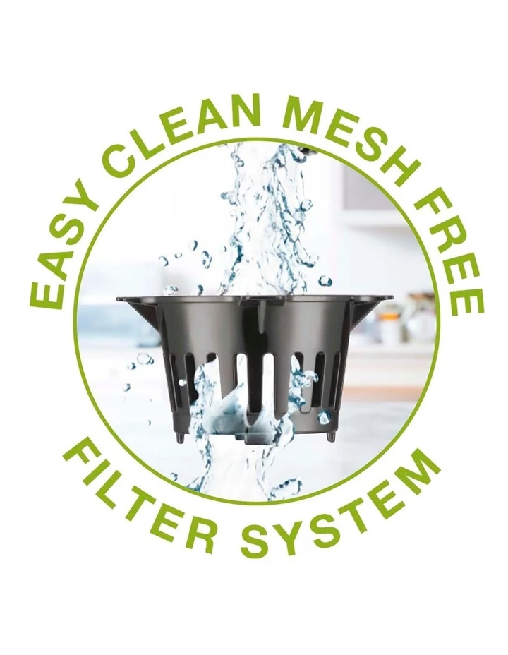 Designed for less mess and easy clean up, the mesh free filter can be simply rinsed under the tap for easy clean up or placed on the top rack of the dishwasher.