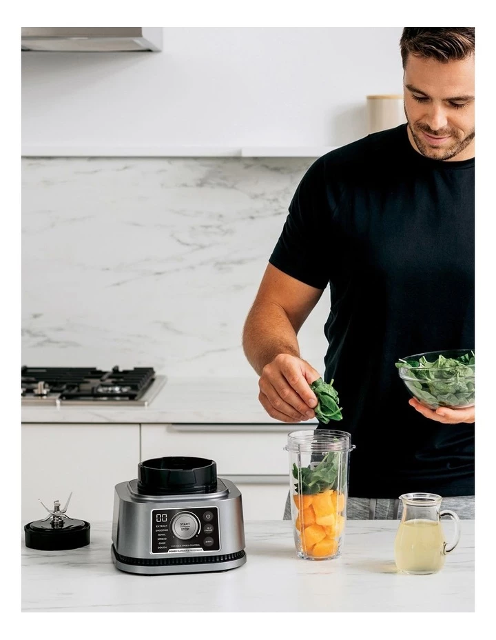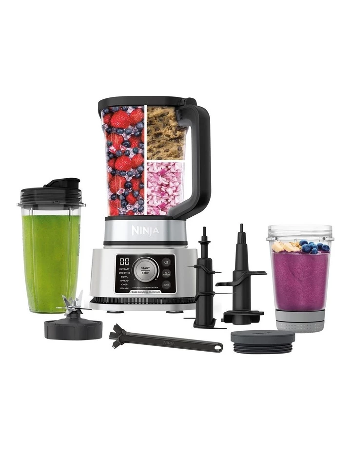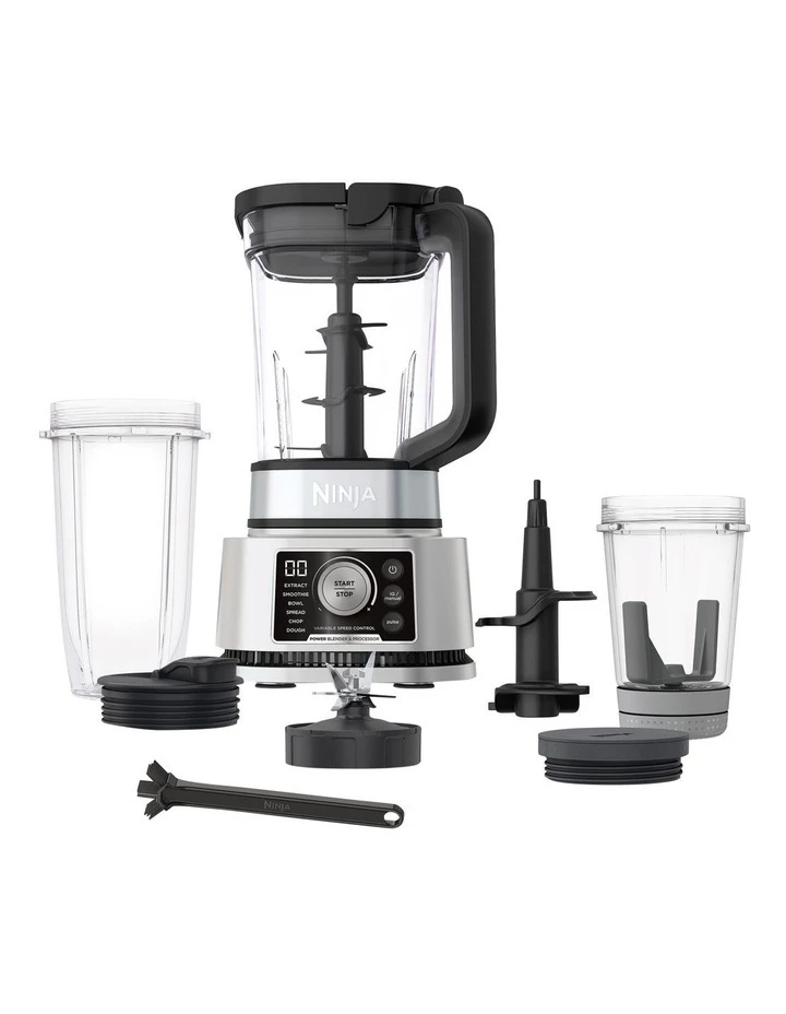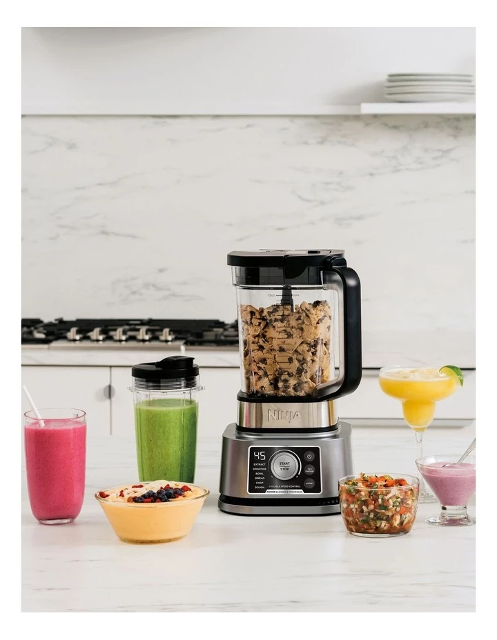 Ninja Foodi Power Blender & Processor System with Power Smoothie Bowl Maker and Power Nutri Cup has Variable Speed Control with smartTORQUE to power through at any speed and never stall. The Power Blender & Processor Pitcher is a blender, liquidiser, food processor, and dough mixer. The Power Nutri Cup and Spout Lid for smoothies. The Power Smoothie Bowl Maker with built-in tamper powers through frozen foods with less liquid for thick smoothie bowls. 1200watts make this Ninja’s Best Total Crushing Blender.