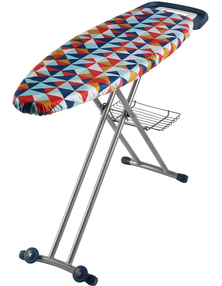 Extra wide board 135 x 45cm, Steam generator tray, retractable iron rest, reversible padded print/non stick cover, adjustable height 75 – 95 cm.