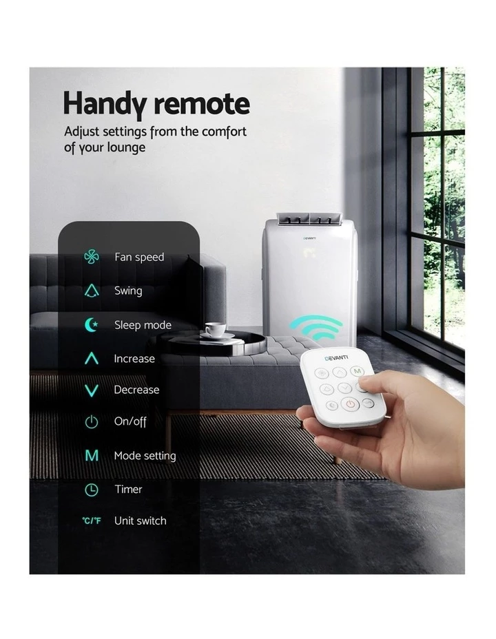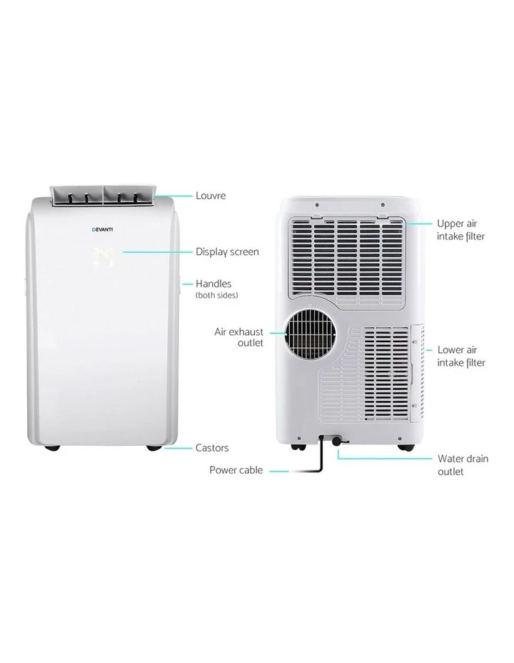 Hot days are not too far away. So why not pick up our Devanti Portable Air Conditioner to help you stay cool comfortably and economically throughout the season. The air conditioner is three appliances rolled into one: air conditioner, 4-speed fan and dehumidifier. There is also an additional automatic water vaporisation system so that you do not need to empty the water tank. The air conditioner rapidly delivers super-cool breezes throughout rooms sized 20m with its adjustable louvre. In whichever mode you are using, you can always count on ample cool air at your preferred temperature settings.