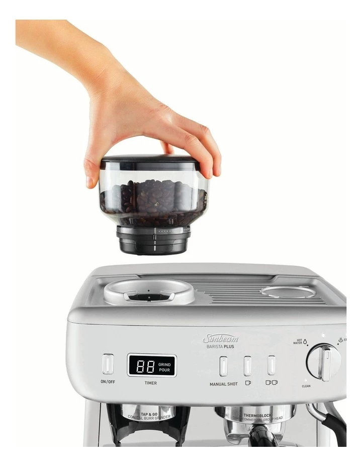 Enjoy cafe style coffee in under 3 minutes with Barista Plus Espresso Machine, the all-in-one coffee machine with the tools to help you become your own barista. Timers are used by baristas to ensure consistent and great tasting coffee. Weve added in-built timers to help you make caf style coffee at home. The integrated stainless steel conical burr grinder allows you to make full-bodied fresh espresso with beans from your local roaster. Now you can easily recreate your favourite coffee just the way you like it -whether its a latte, flat white, cappuccino or a long black.