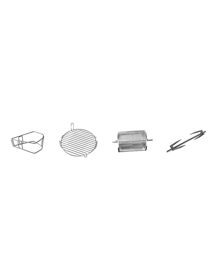 - four accessories, baking cage, rack, tongs and chicken rotisserie